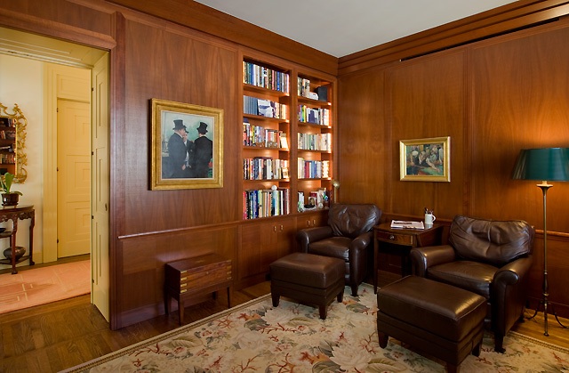 A gut renovation was performed on this East 88th Street penthouse residence. Built-up wood mouldings and full wood panel walls were installed in keeping with the pre-war design of the building. Pearwood was chosen for the wood panel walls and built-ins in the library. Oak was selected for the new floors throughout the apartment.